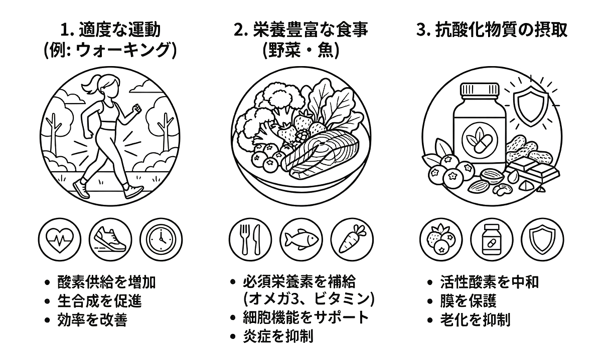 ミトコンドリアを元気にするには、次の3つが重要です。